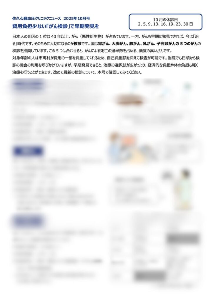 今月のクリニックニュース「費⽤負担少ない『がん検診』で早期発⾒を」