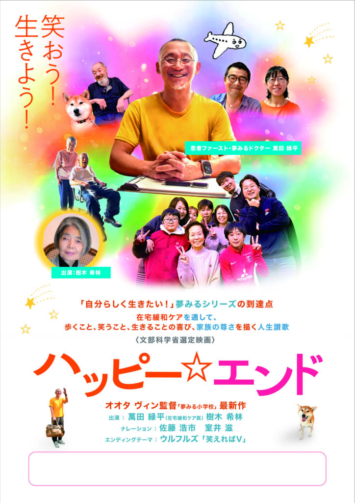 映画は、余命宣告を受けた患者さんたちを、人生の最期まで自分らしく生きぬけるよう伴走する「在宅緩和ケア」を行う群馬県の萬田緑平医師と、患者さんおよびそのご家族を追ったドキュメンタリー映画『ハッピー☆エンド』を上映します。今年、全国数多くの映画館で公開されたばかりの新作映画です。